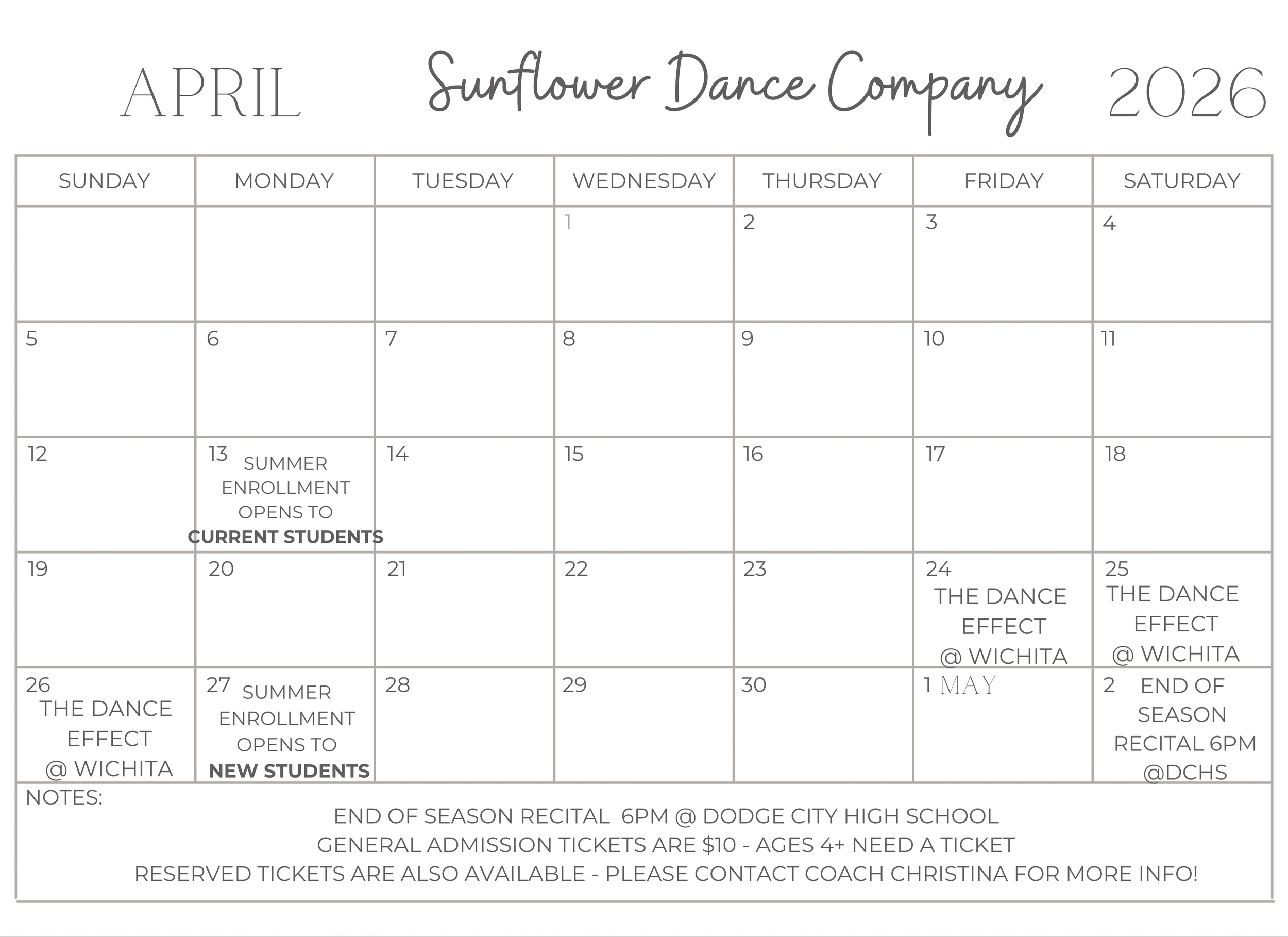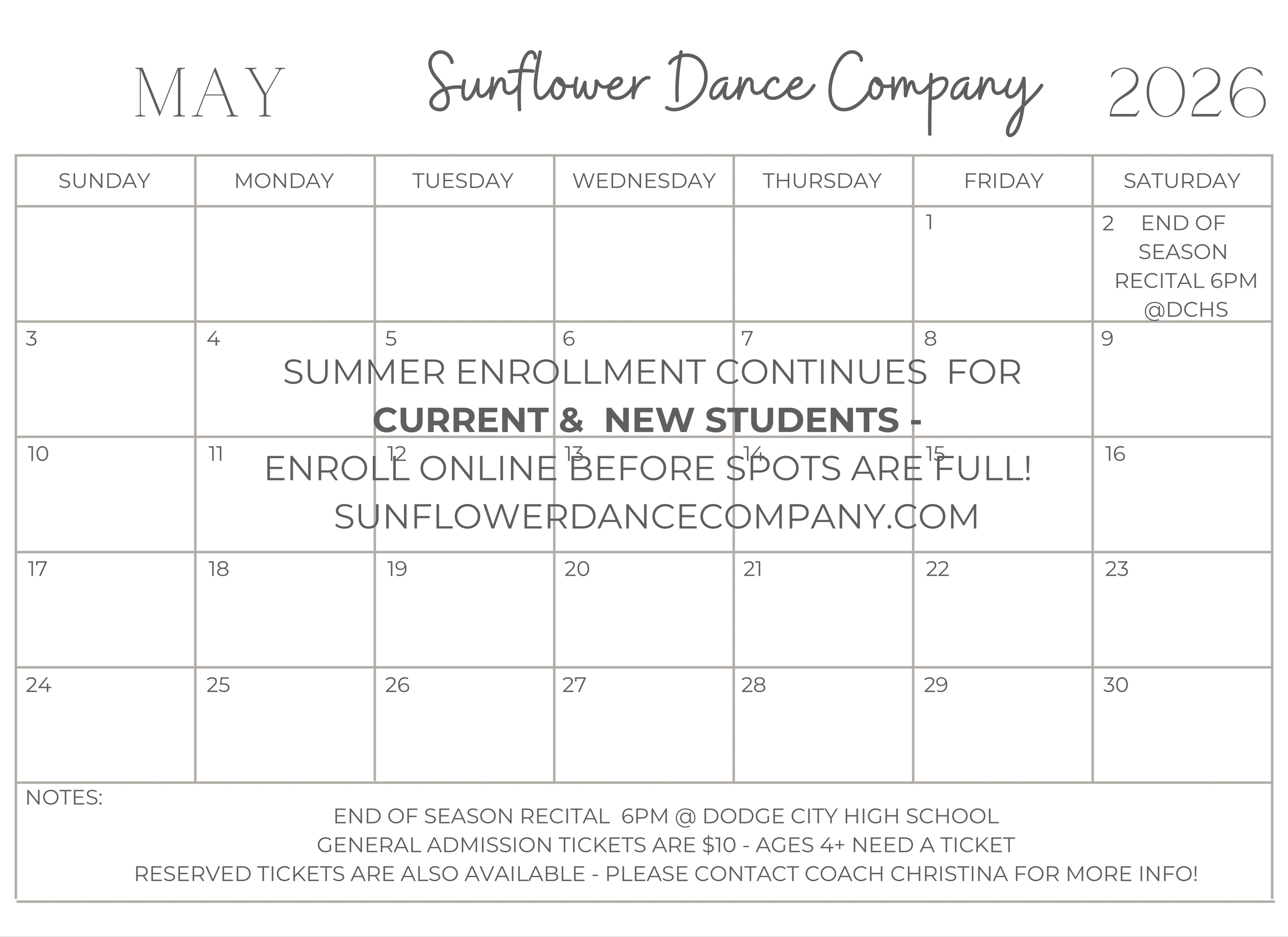 CALENDAR May 2 End of Season Recital Saturday, May 2, 2026 5:00 PM 8:00 PM Google Calendar ICS View Event → May 11 Competition Team Group Tryouts Monday, May 11, 2026 6:00 PM 7:00 PM Google Calendar ICS View Event →